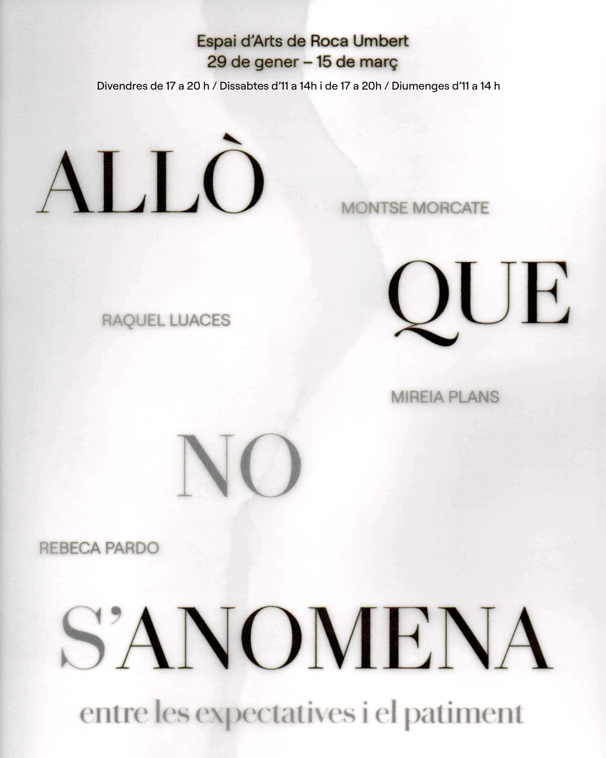 L’exposició reuneix el treball que les artistes Montse Morcate, Mireia Plans, Raquel Luaces i Rebeca Pardo han desenvolupat, en part, durant la seva residència a Roca Umbert i també en el marc del projecte de recerca acadèmic Representacions contemporànies del dol i el patiment: visibilitat, agència i transformació social a través de la imatge(Generación del Conocimiento 2022- Ministerio de Ciencia e Innovación). Des de pràctiques tan diverses com la instal·lació o el fotollibre, les artistes aborden violències quotidianes però estructurals relacionades amb la maternitat, la salut mental, la pressió estètica, la tecnologia i els mecanismes de reconeixement social.